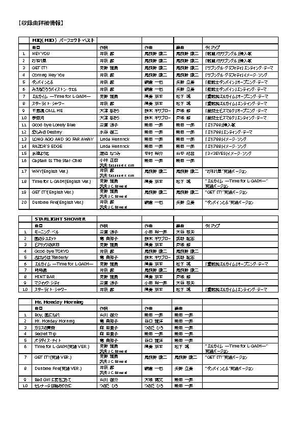 ①HEY YOU ②わすれ草 ③GET IT! ④Coming Hey You ⑤ダンバインとぶ ⑥みえるだろうバイストン・ウェル ⑦エルガイム-Time for L-GAIM- ⑧スターライト・シャワー ⑨不思議CALL ME ⑩夢銀河 ⑪Good-bye, Lonely Blue ⑫悲しみのDestiny ⑬LONG AGO AND SO FAR AWAY ⑭RAZOR’S EDGE ⑮永遠よりも ⑯Captain is The Star-Child ⑰WHY(English Ver.) ⑱Time for L-GAIM(English Ver.) ⑲GET IT!(English Ver.) ⑳Dunbine Fire(English Ver.)
