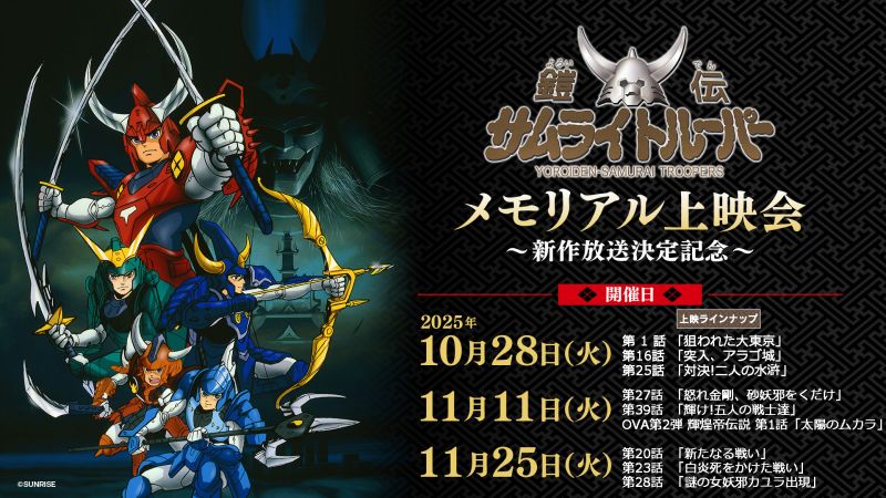 10月28日(火) 、11月11日(火) 、11月25日(火)の3日間にわたって新宿ピカデリーにて開催される『鎧伝サムライトルーパー』メモリアル上映会~新作放送決定記念~の、各回で上映される話数が公開!、豪華登壇ゲストが旧作シリーズの中から厳選したラインナップにご注目!