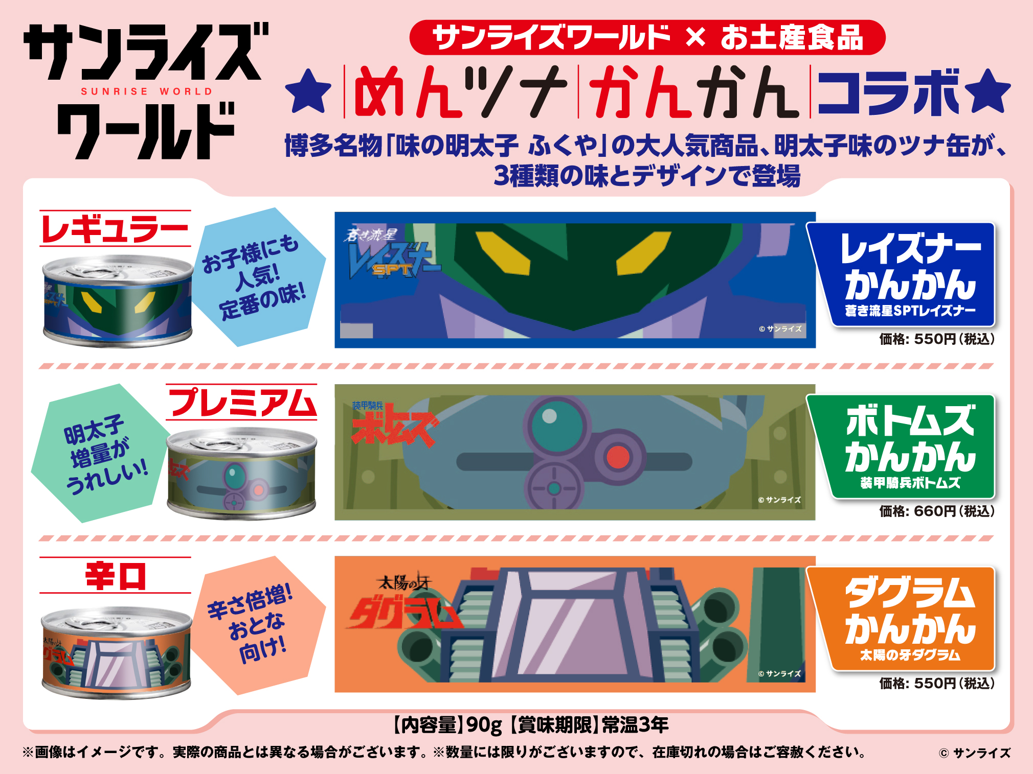 博多名物「味の明太子 ふくや」の大人気商品、明太子味のツナ缶「めんツナかんかん」が『蒼き流星SPTレイズナー』『装甲騎兵ボトムズ』『太陽の牙ダグラム』とコラボ、お土産にもピッタリなオリジナルデザイン3種の「めんツナかんかん」をぜひお求めください。
