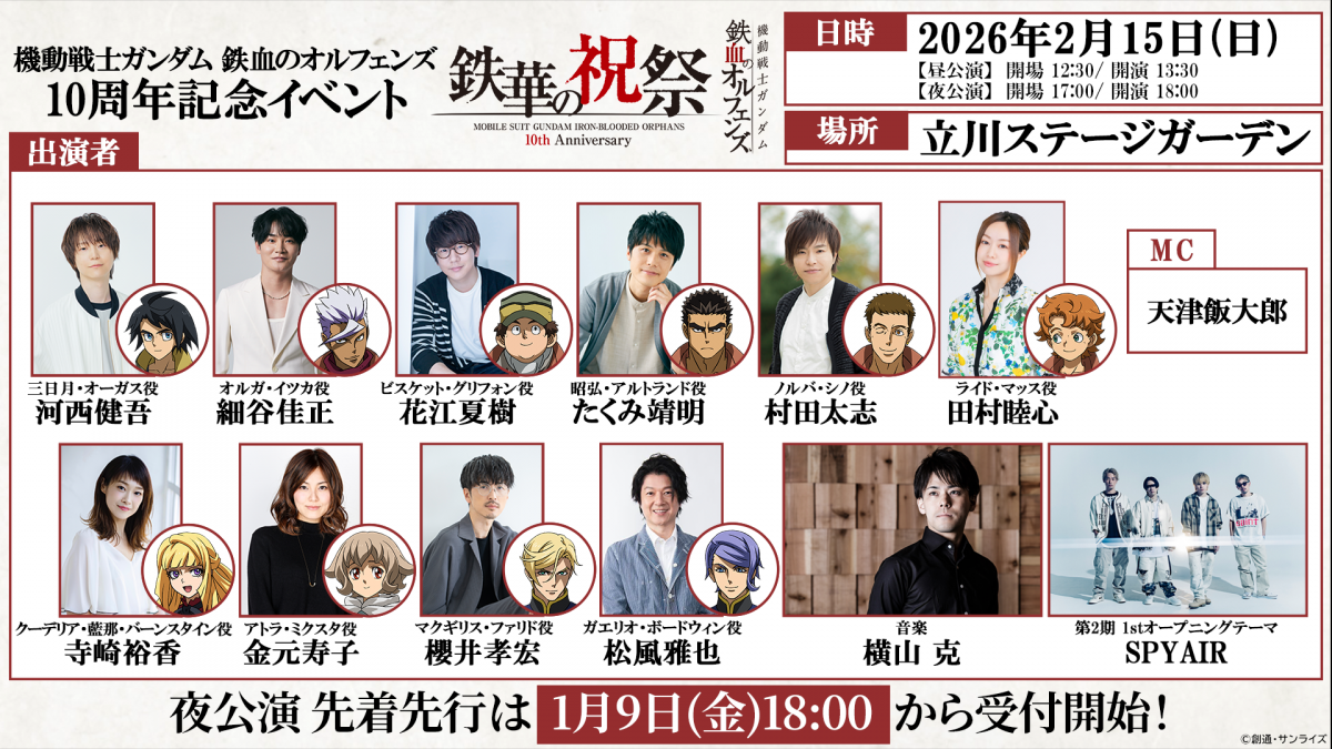 2026年2月15日(日)に立川ステージガーデンにて行われる「機動戦士ガンダム 鉄血のオルフェンズ 10周年記念イベント -鉄華の祝祭-」夜公演チケットの「先着先行」受付が、1月9日(金)18:00よりスタートする。受付期間は1月16日(金)18:00まで。