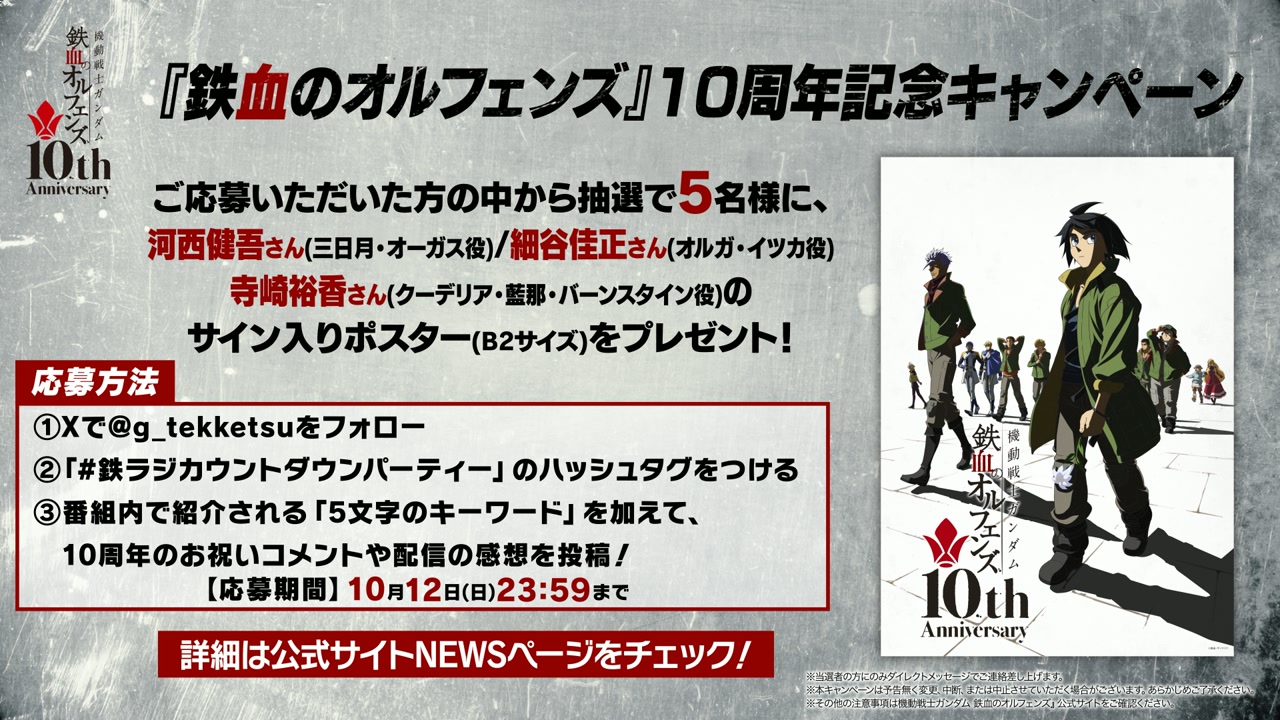 さらに、『鉄血のオルフェンズ』10周年記念キャンペーンも実施中!番組内で発表された「5文字のキーワード」を集めていただくと、河西健吾さん、細谷佳正さん、寺崎裕香さんのサイン入りのプレゼントをゲットできます!