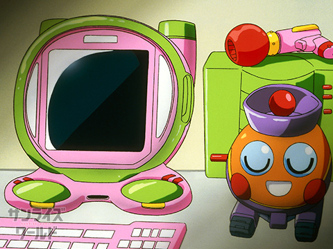 第1話のヒロイン栗本雪菜のパソコン(左)と、雪菜が開発作成し、設定時刻になると動き出すロボット型目覚まし時計(右)。